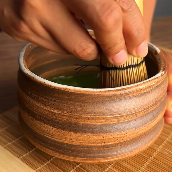 BEBIDA: Coloca 1 g de matcha (una cucharadita rasa) en un bol y vierte 70 ml de agua a 70–75 °C.