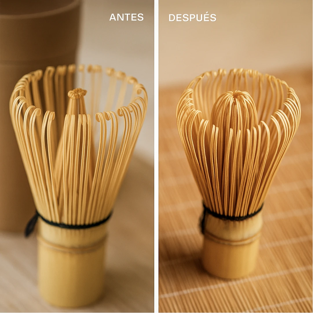 El matcha es un té verde en polvo. A diferencia de los tés tradicionales, no se infunde, se mezcla. Para esto, el batidor japonés conocido como chasen es el accesorio ideal. Te permite obtener una mezcla homogénea y una espuma atractiva en solo unos segundos, potenciando todos los sabores del matcha: